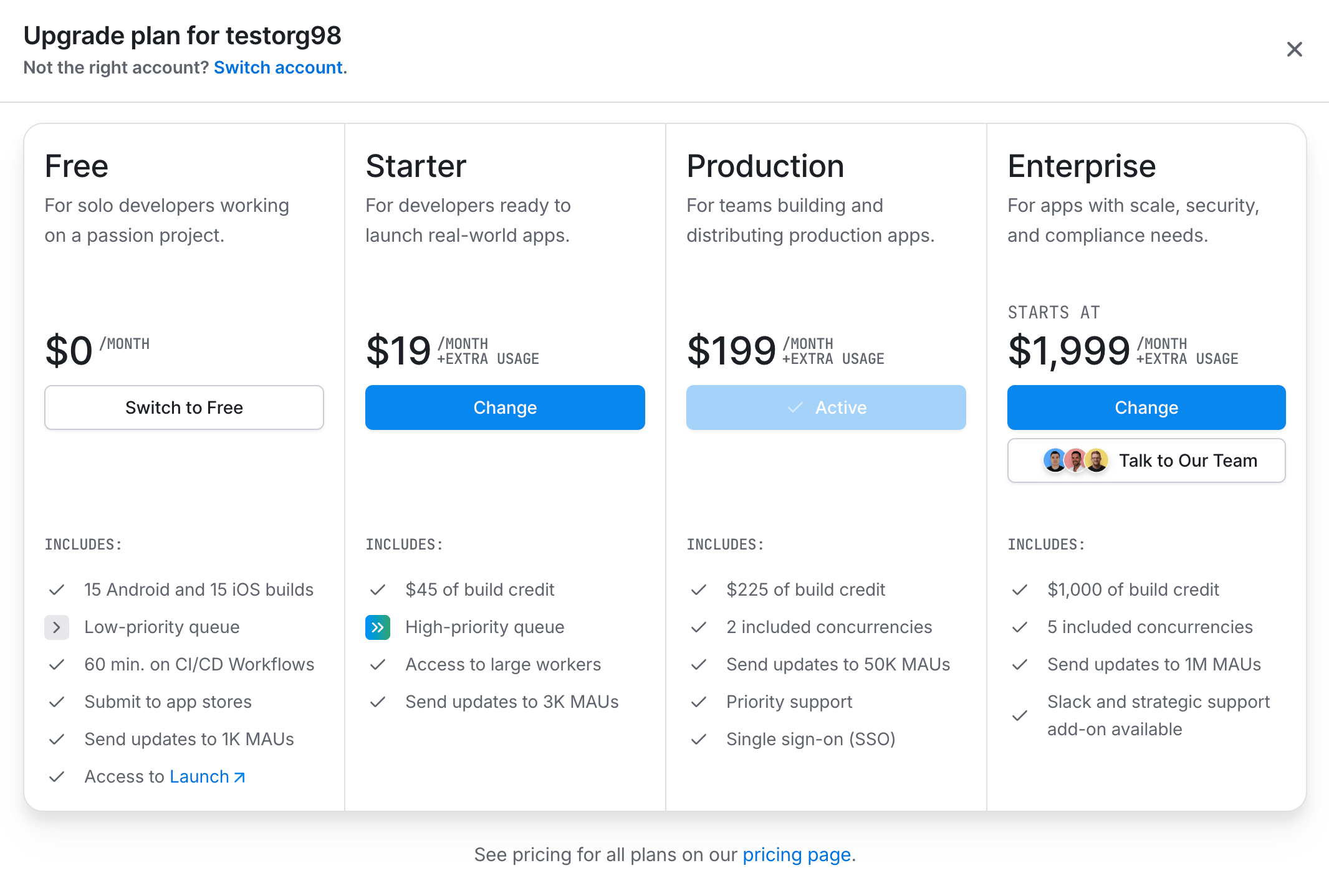 Learn how to update, downgrade, or cancel your Expo account's plans and manage billing details.