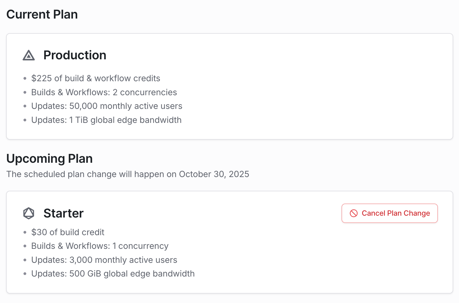 - After confirming your account for a plan downgrade to Starter, the same information is also reflected under Billing > Upcoming Plan.