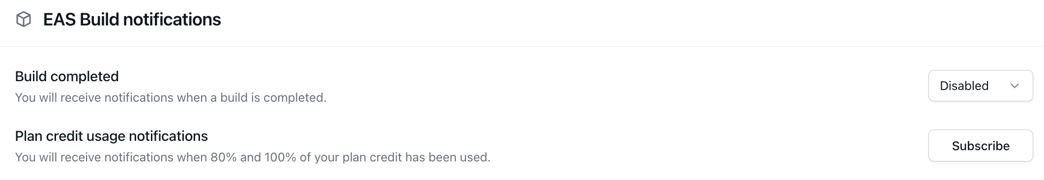 - Under EAS Build notifications, click Subscribe for Plan credit usage notifications.