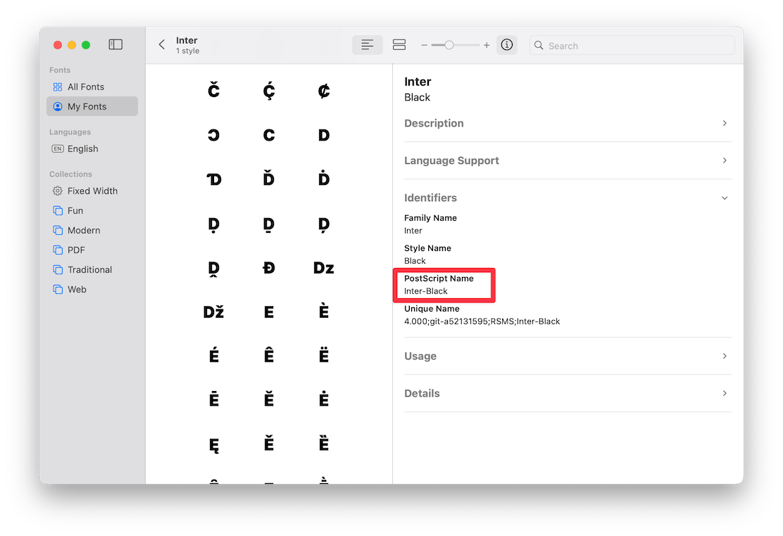 For example, Inter Black font file's PostScript name is Inter-Black.