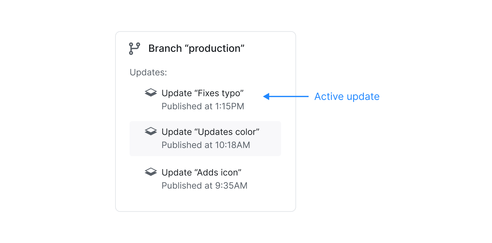 This default linking works great if you have a deployment process where you have multiple consistent Git and EAS branches. For instance, we could have a "production" branch and a "staging" branch, both on Git and on EAS. Paired with a GitHub Action, we could make it so that every time a commit is pushed to the "staging" Git branch, we publish to the "staging" EAS Update branch, which would make that update apply to all our builds with the "staging" channel. Once we tested changes on the staging builds, then we could merge the "staging" Git branch into the "production" Git branch, which would publish an update on the "production" EAS Update branch. Finally, the latest update on the "production" EAS Update branch would apply to builds with the "production" channel.