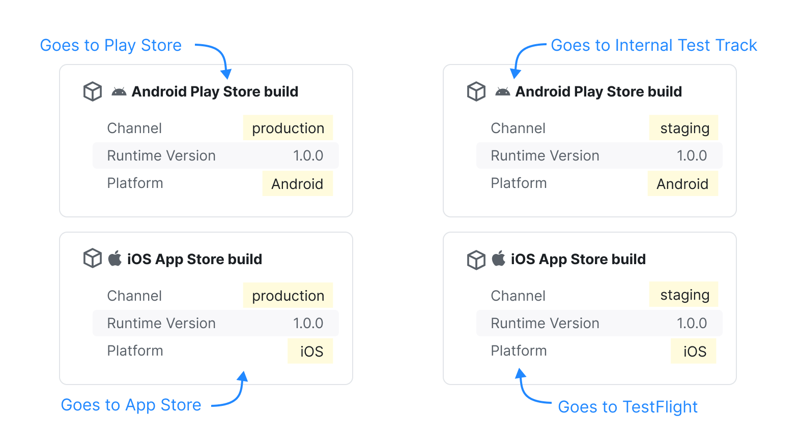 eas.json. For instance, we may have an Android and an iOS build with a channel named "production", while we have another pair of builds with a channel named "staging". Then, we can distribute the builds with the "production" channel to the public app stores, while keeping the "staging" builds on the Play Store Internal Track and TestFlight. Later when we publish an update, we can make it available to the builds with the "staging" channel first; then once we test our changes, we can make the update available to the builds with the "production" channel. - Runtime version: The runtime version describes the JS-native interface defined by the native code layer that runs our app's update layer. It is defined in a project's app config. Whenever we make changes to our native code that change our app's JS-native interface, we'll need to update the runtime version. Learn more.