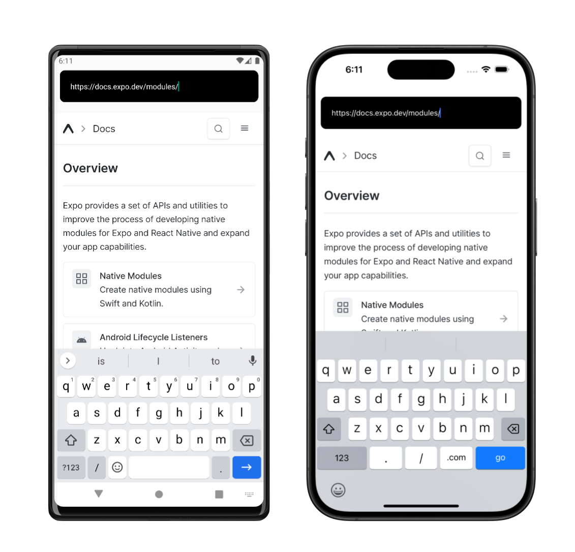 In this tutorial, you'll build an example module with a native view that renders a WebView. For Android, you'll use the WebView component, and for iOS, WKWebView. Web support can be implemented using an iframe and is left as an exercise for you.