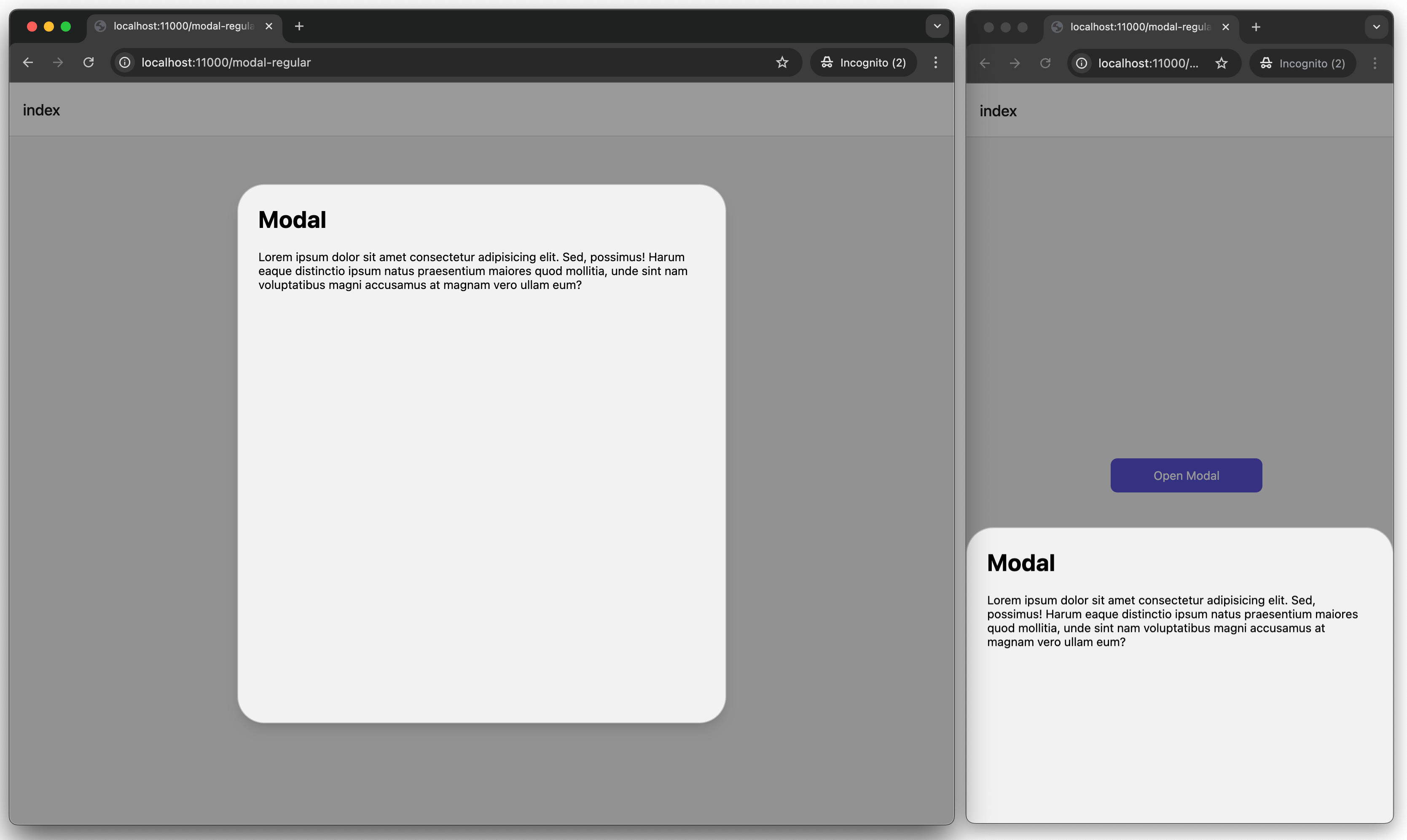 presentation | 'modal', 'formSheet', 'transparentModal', 'containedTransparentModal' | Modal presentation style. On screens with width more than 768px, all styles display as a centered overlay (for example, a lightbox). On screens with width less than 768px, formSheet is used to display as a bottom sheet.When set to transparentModal, it displays as an overlay without a completely obscure background content. Detents and sheet grabber properties are not applied. This presentation is useful when building your own custom modal. Similar to transparentModal, when set to containedTransparentModal, it displays as an overlay without a completely obscure background content. Detents and other properties are not applied. This presentation is useful when building your own custom modal. |