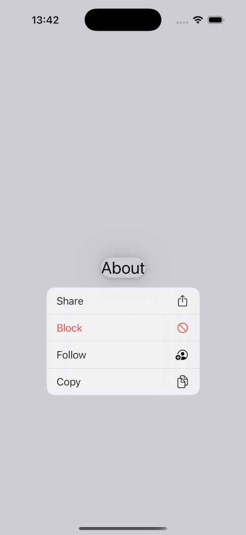 <Link href="/about"> <Link.Trigger>About</Link.Trigger> <Link.Menu> <Link.MenuAction title="Share" icon="square.and.arrow.up" onPress={handleSharePress} /> <Link.MenuAction title="Block" icon="nosign" onPress={handleBlockPress} /> <Link.MenuAction title="Follow" icon="person.crop.circle.badge.plus" onPress={handleFollowPress} /> <Link.MenuAction title="Copy" icon="doc.on.doc" onPress={handleCopyPress} /> </Link.Menu> </Link>