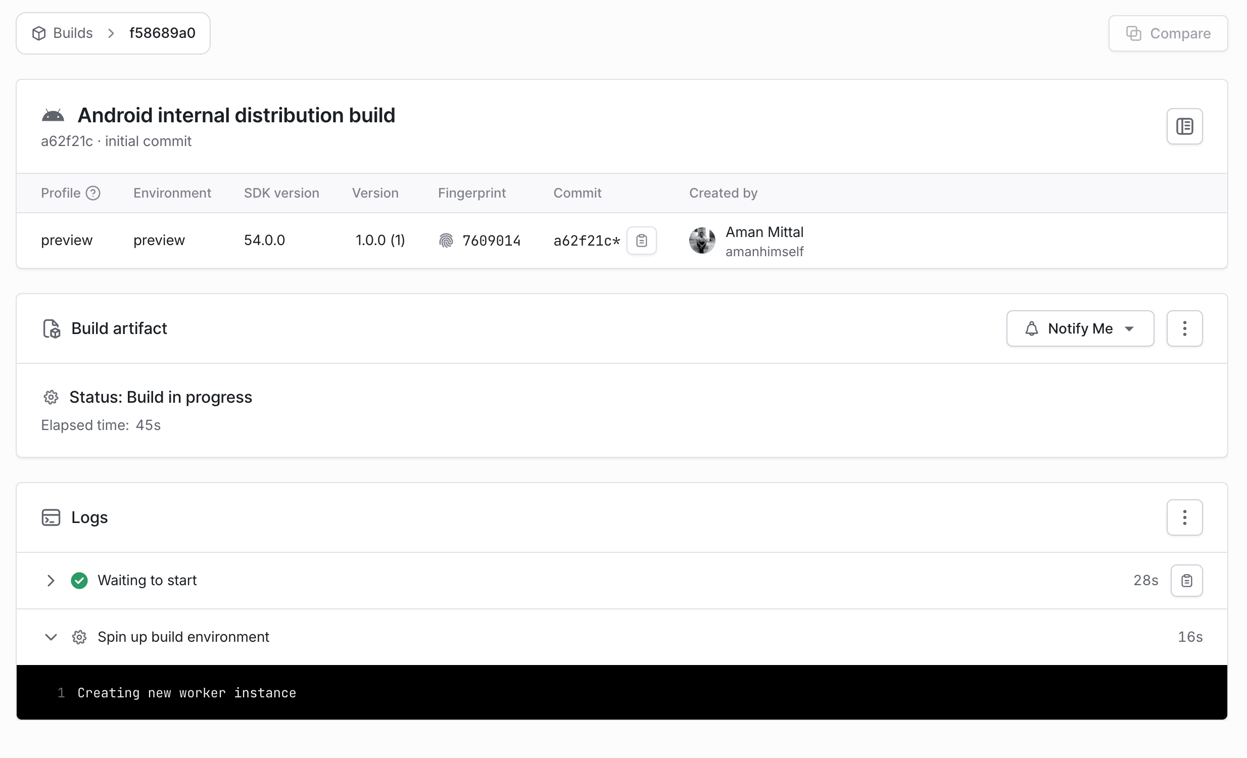 - eas build --platform android --profile preview- This command triggers the EAS Build, and on the EAS dashboard, we can see the build's progress: