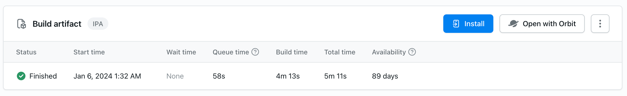 - On the EAS dashboard, under Build artifact, click the Open with Orbit.