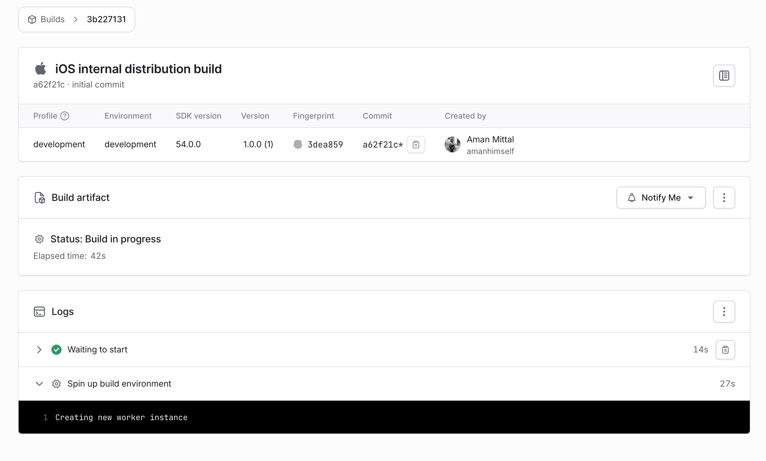 In the above image, the current status of the Build artifact shows that the build is in progress. Upon completion, this section will offer an option to download the build. The Logs outlines every step taken during the iOS build process on EAS Build. For the sake of brevity, we won't explore each step in detail here. To learn more, see iOS build process.