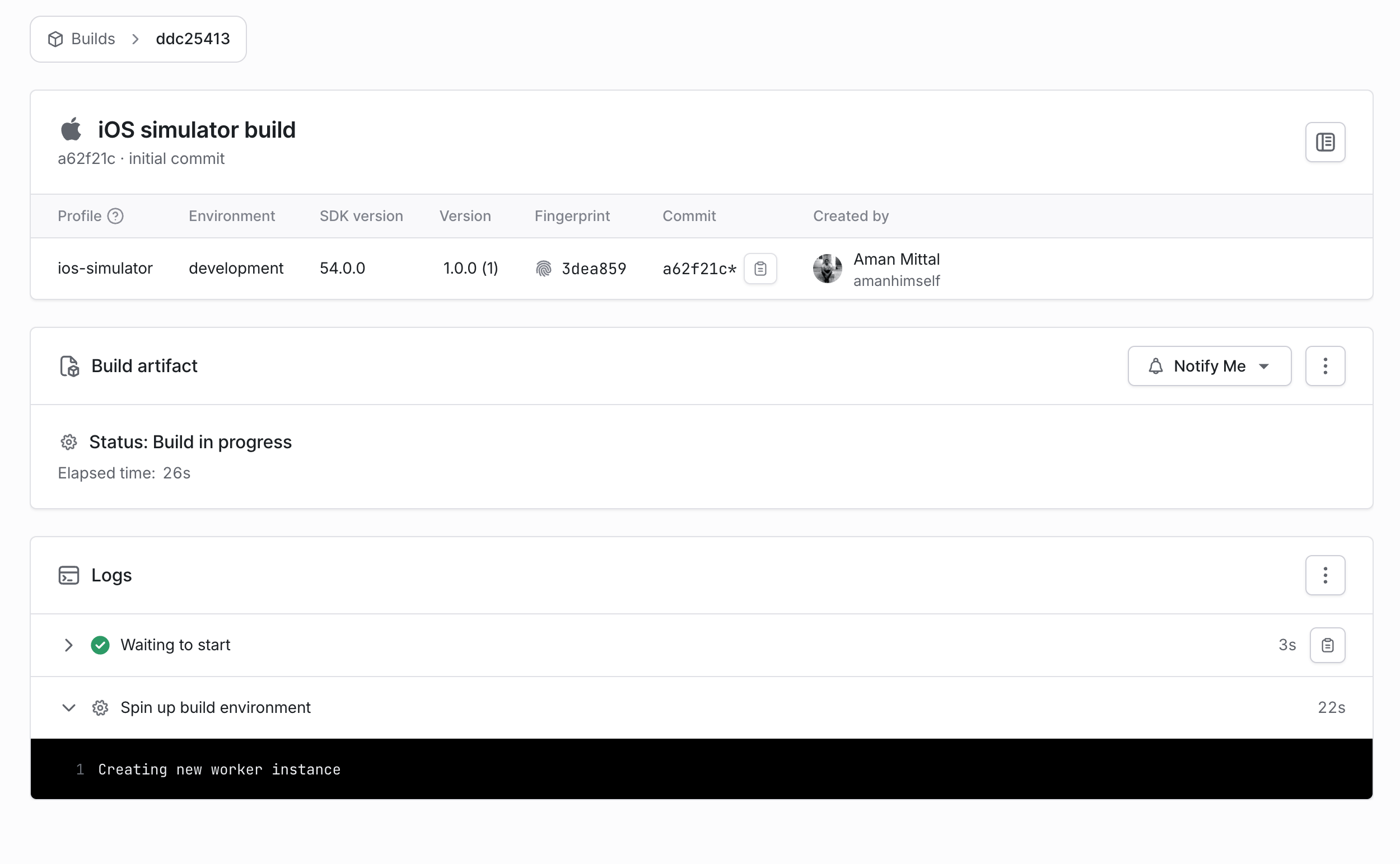 In the above image, the current status of the Build artifact shows that the build is in progress. Upon completion, this section will offer an option to download the build. The Logs outlines every step taken during the iOS build process on EAS Build. For the sake of brevity, we won't explore each step in detail here. To learn more, see iOS build process.
