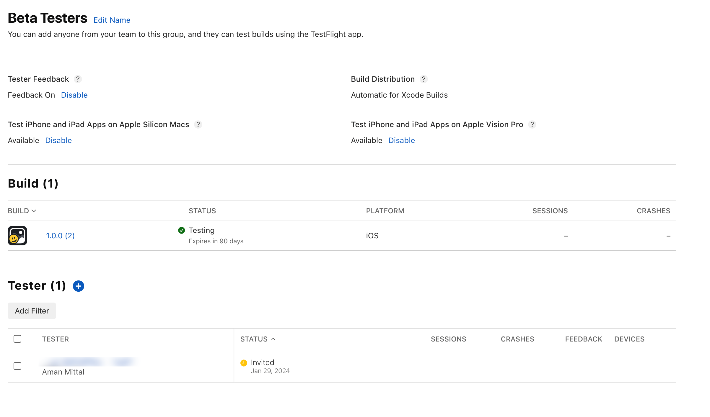 Note: Similar to internal testing, we can also create a group for inviting external testers using TestFlight. Where internal testing has a limit of 100 users, TestFlight allows sharing a test release version externally with up to 10,000 testers and provides a publicly shareable link. For brevity, we are not going to cover those steps in this tutorial.